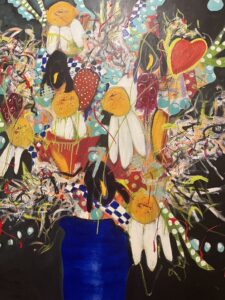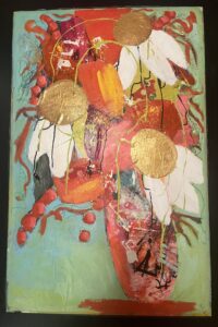 Gold often symbolizes value, worth. or spiritual insight rising from stuggle. The upright flowers suggest resilience. Can beauty coexist with disorder? Can wounds be transformed into something precious?