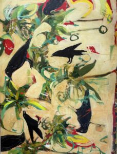 This layered, dreamlike piece invites exploration of the subconscious. The black birds symbolize intuiton, mystery, or messages from the unseen. The work reflects the process of navigation confusion to find meaning. It offers a visual dialogue between inner clarity and chaos, presence and absence.