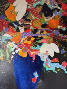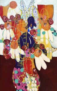 The overflowing bouquet can be interpreted as a visual representation of inner thoughts and emotions being externalized. —joy, confusion, grief, hope—intertwining in a raw yet harmonious dance.